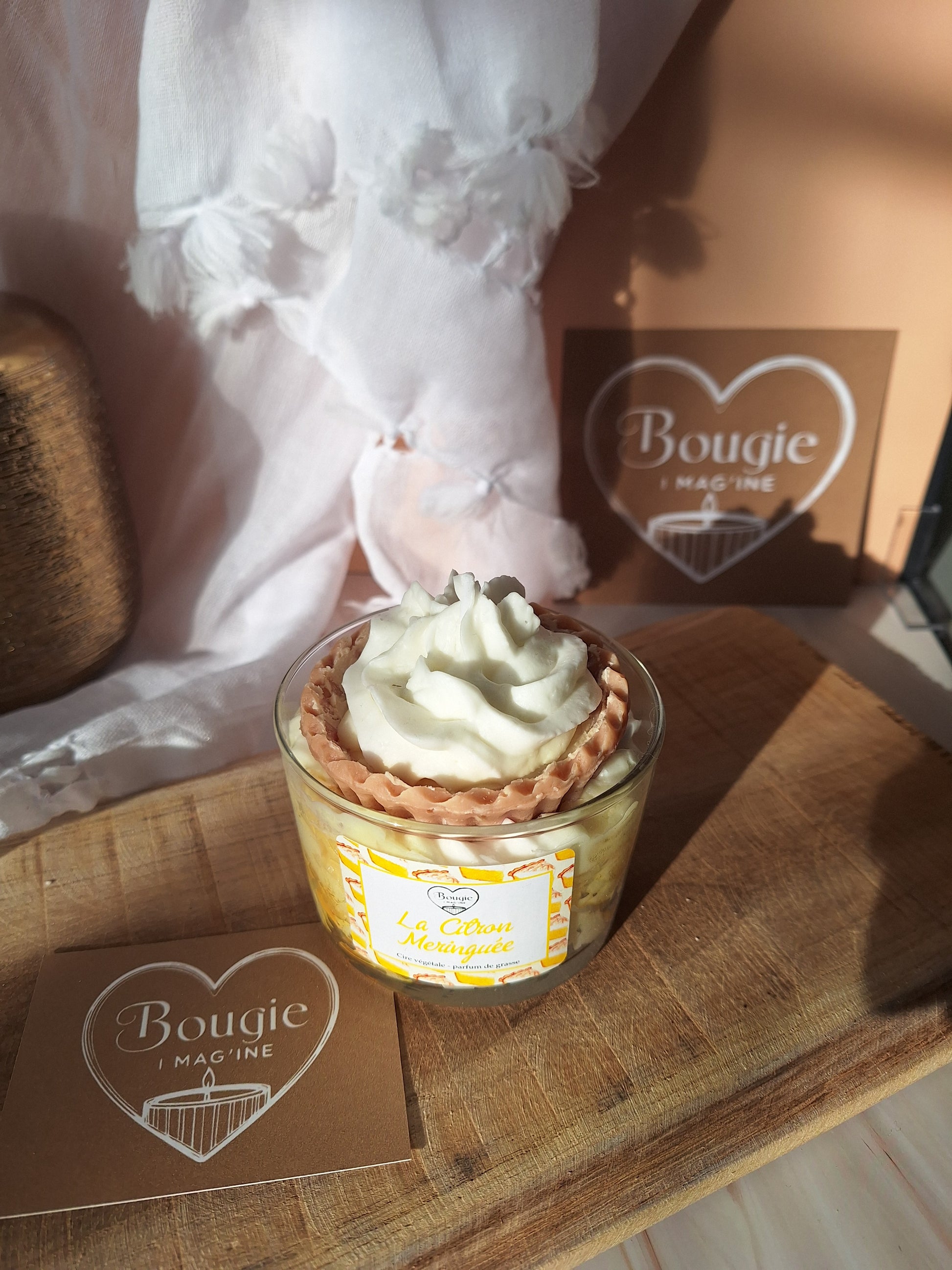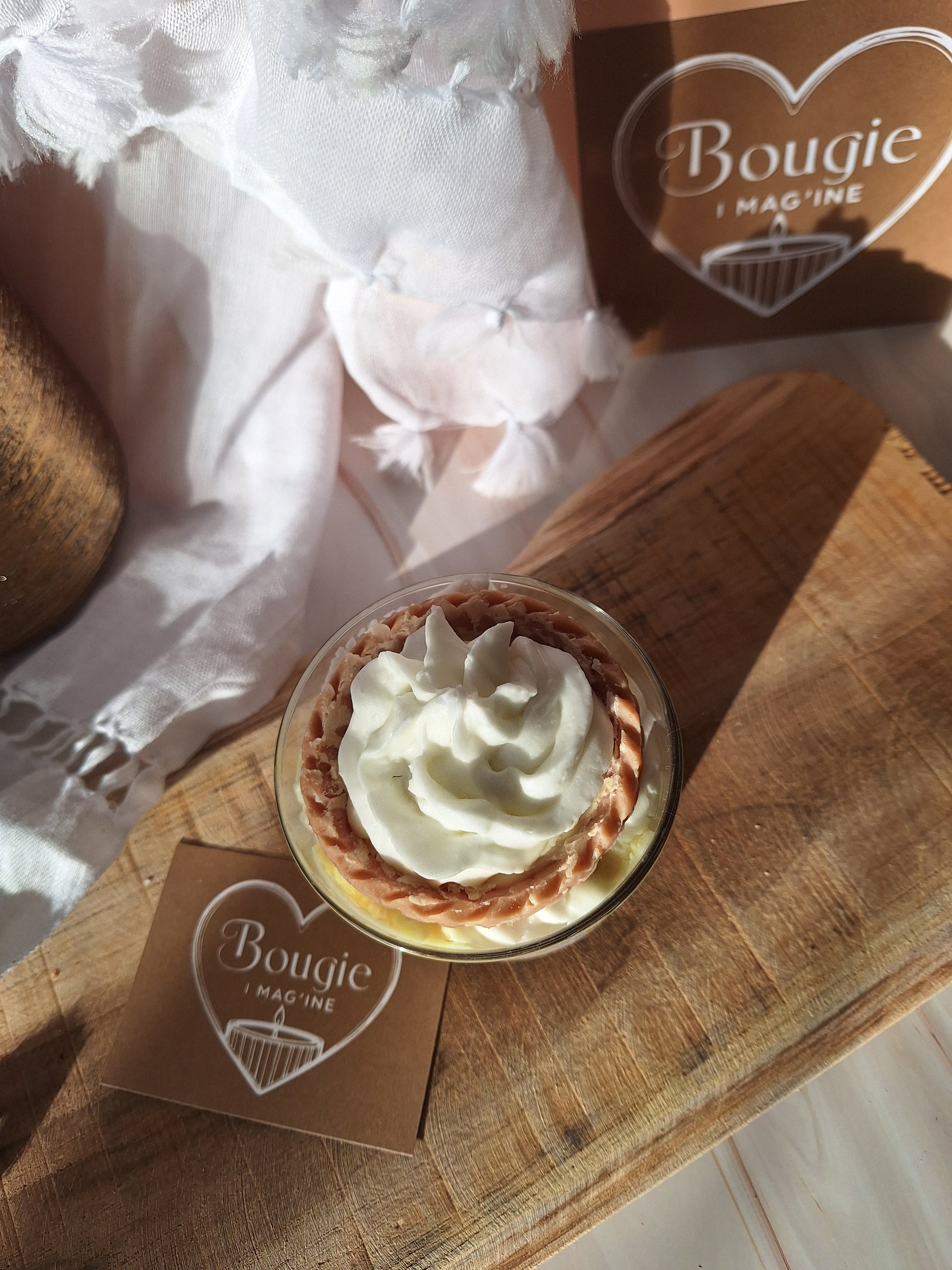 Et si une bougie pouvait éveiller vos sens comme une pâtisserie sortant du four ? Laissez-vous tenter par la bougie gourmande façon chantilly, surmontée d’une magnifique mini tarte citron meringuée en cire et chantilly, posée délicatement sur un nuage de chantilly parfumée. Un vrai bonheur visuel et olfactif, parfait pour cocooner votre intérieur.