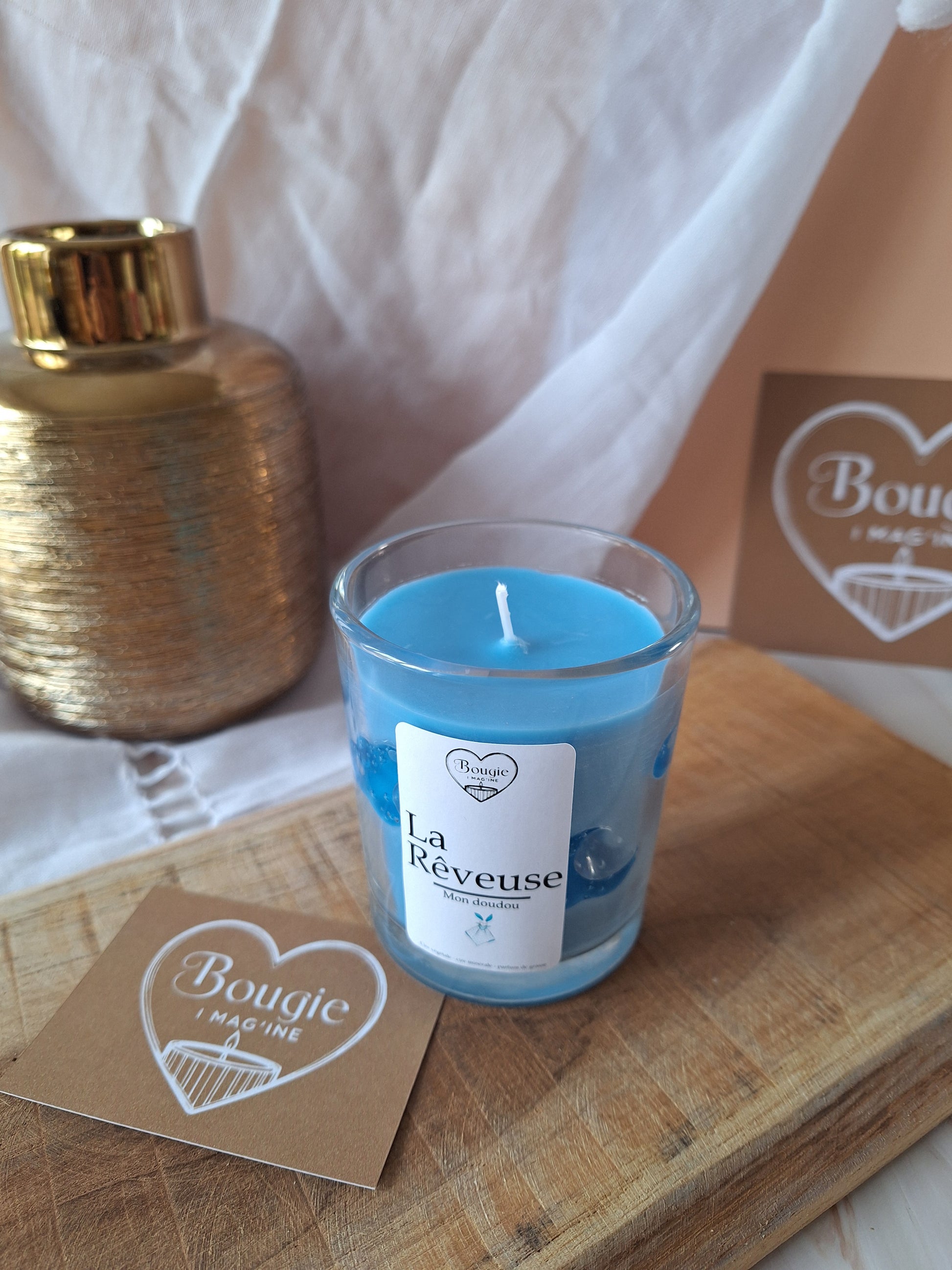 Laissez-vous emporter par la délicatesse de La Rêveuse, une bougie artisanale qui invite à la détente et à l’imaginaire. Coulée dans une cire bleue apaisante, elle est décorée de jolis petits nuages transparents en paraffine, soigneusement collés à l’intérieur du contenant. Le résultat ? Une atmosphère légère, douce, presque magique… comme une promenade au-dessus des toits.